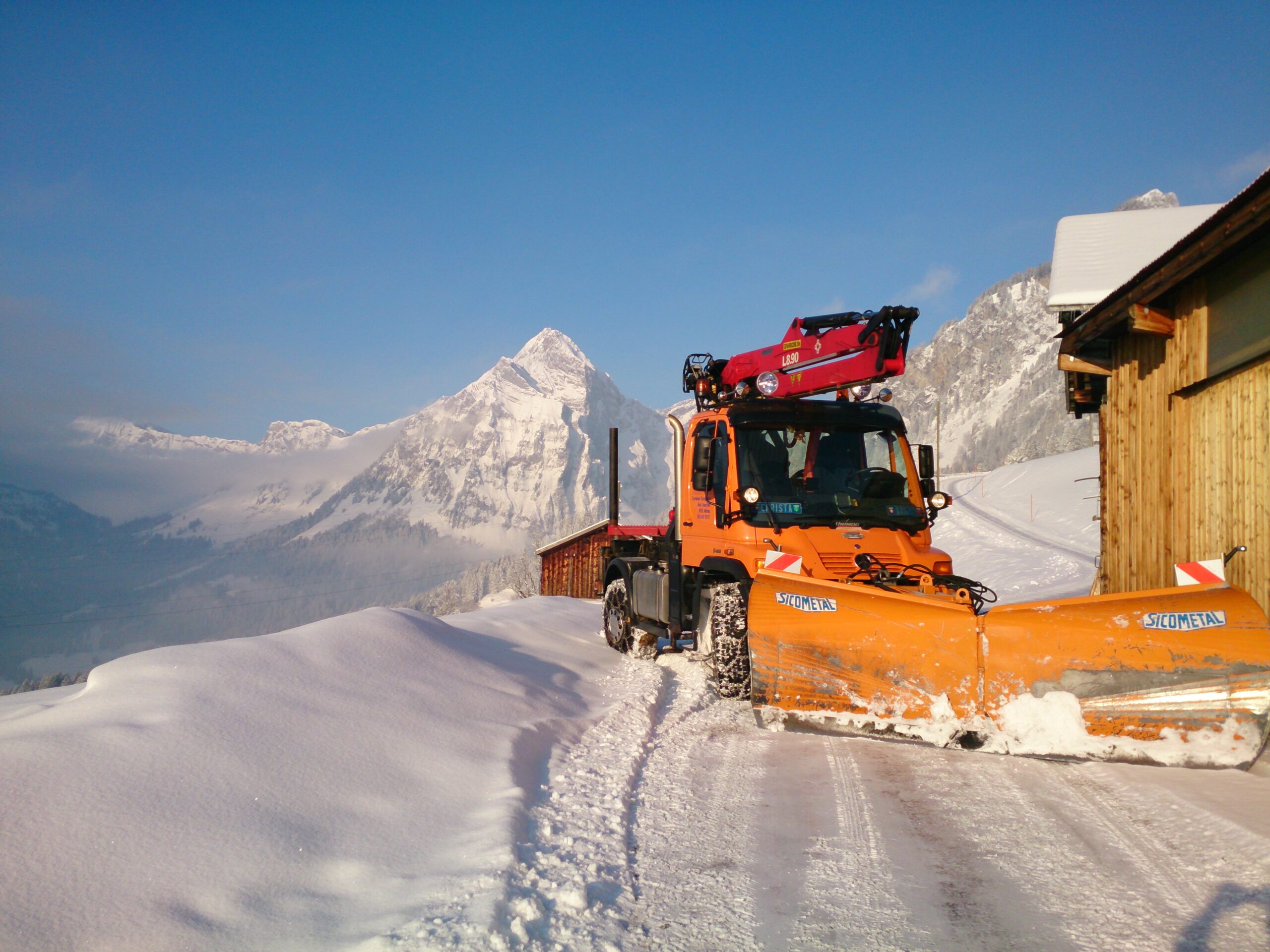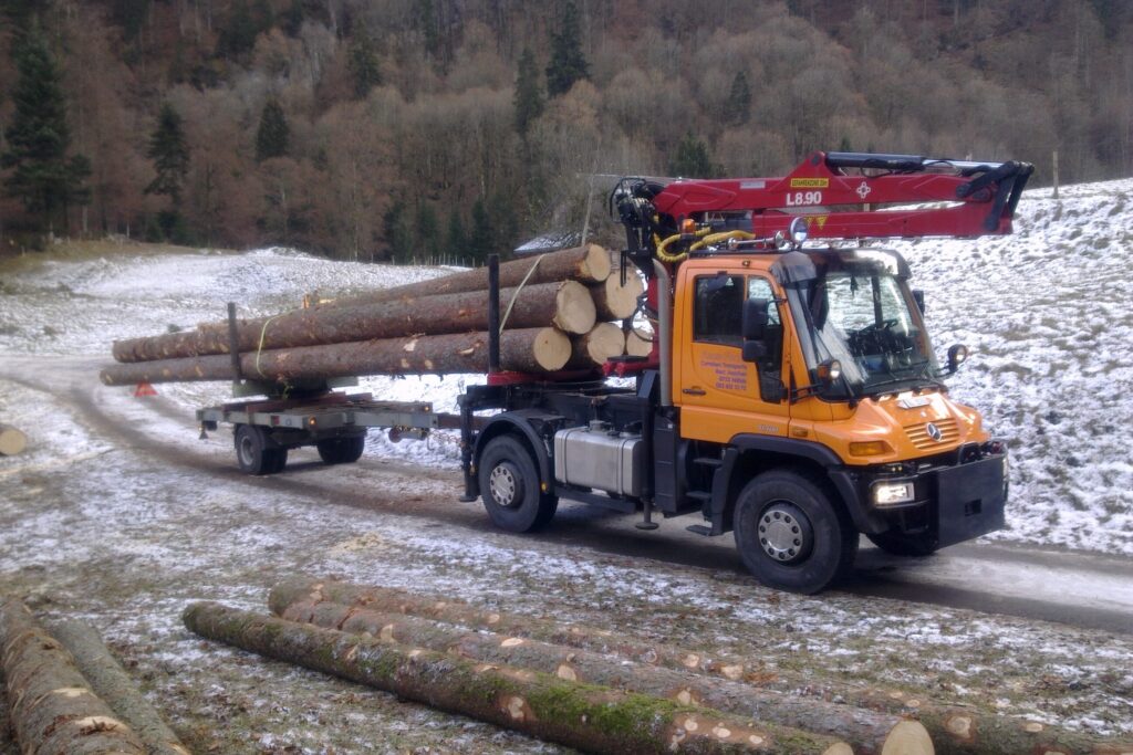Unser Unimog Zugfahrzeug ist speziell auf den engen Berg- und Waldstrassen extrem wendig und flexibel.